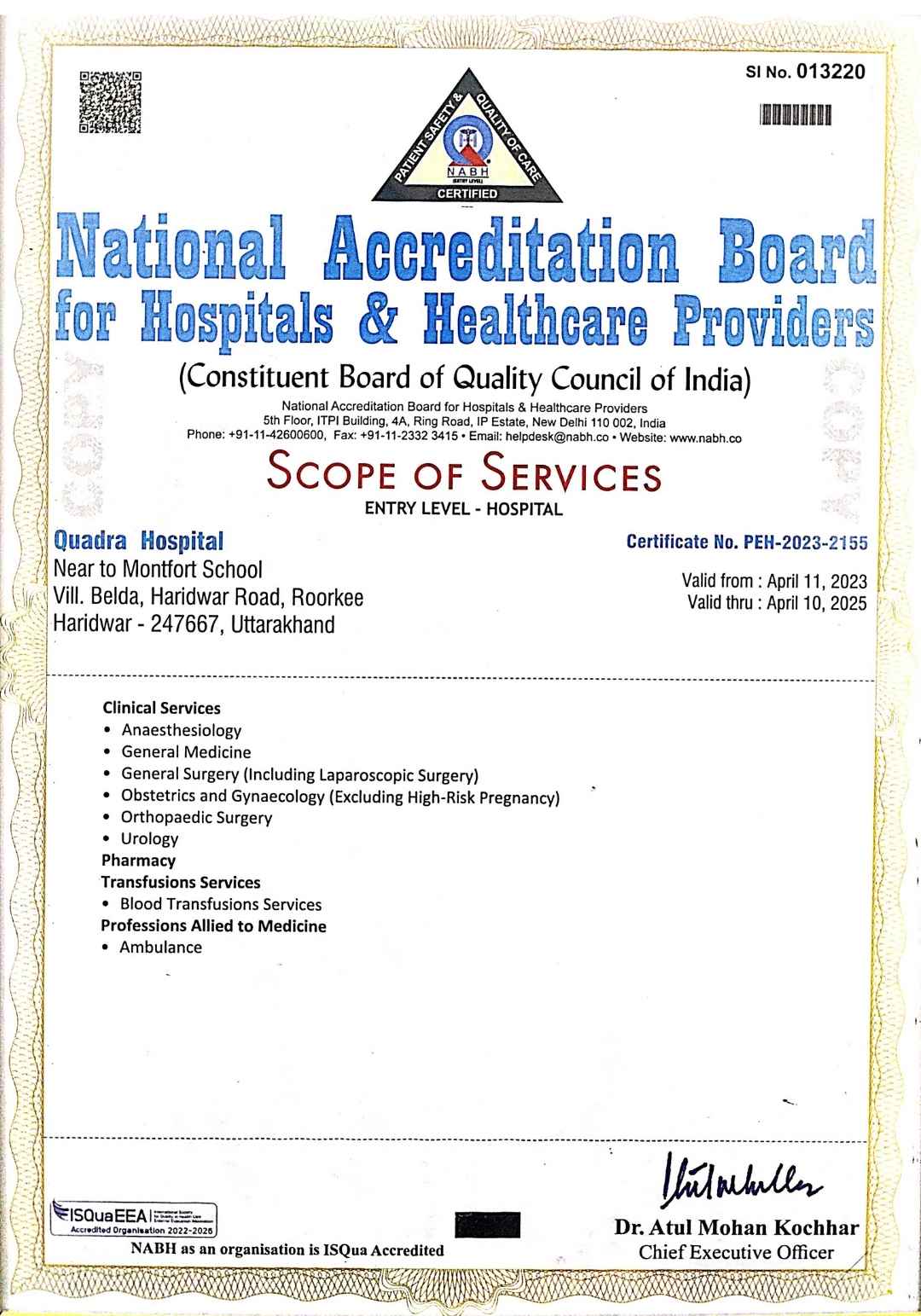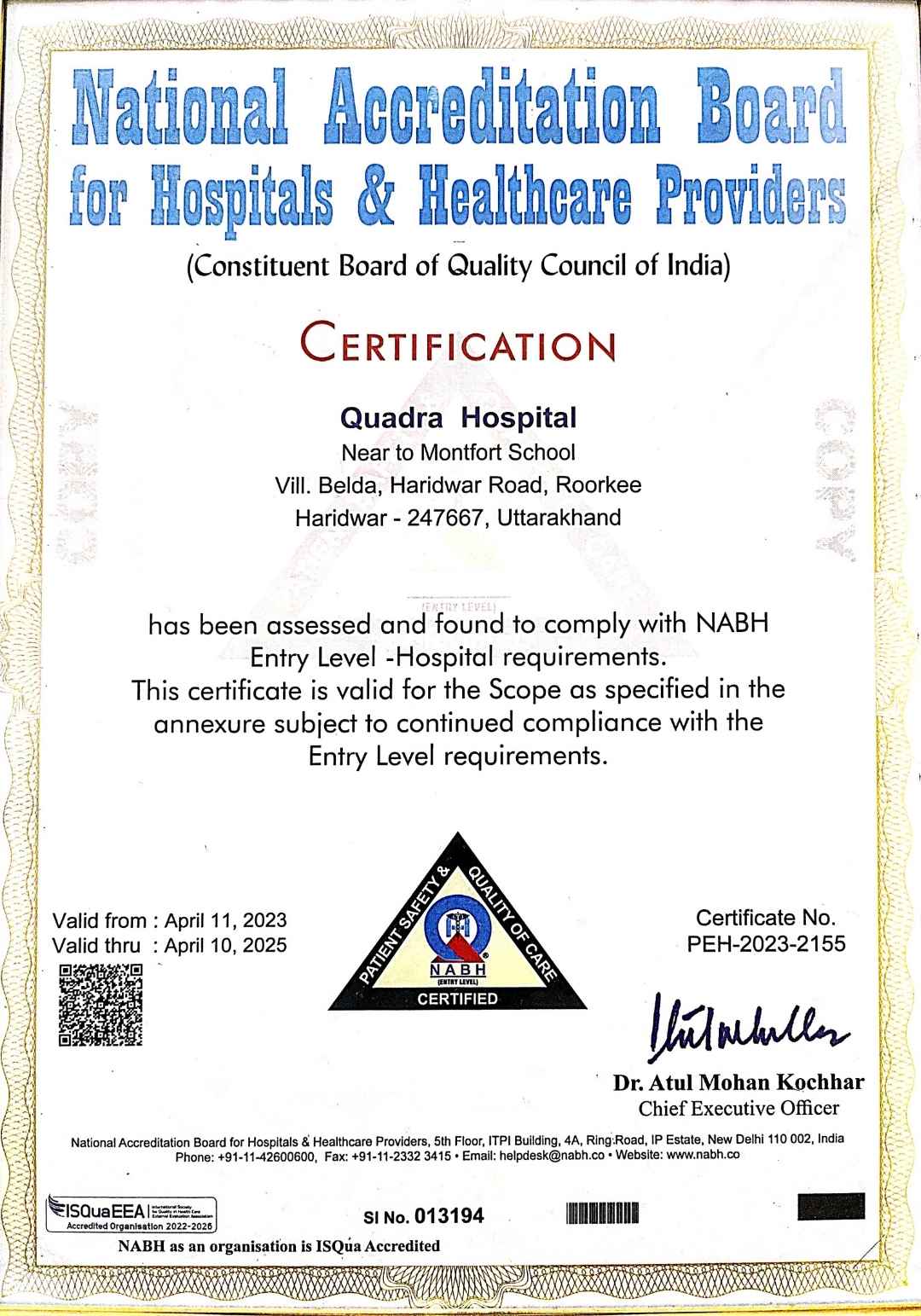Quadra hospital at Roorkee, Haridwar, a NABH Certified (Entry Level) Hospital Hospital services in our country, whether high end Multi or Single Specialty, Tertiary or Secondary Care or first level Primary Health Centers, most suffer because of an unstructured co-ordination between support functions, right from registration to the final discharge of the patient. Whether it is maintaining or recording the history of customer health, or providing timely services like nursing, diet supply, housekeeping or equipment management (very little in these days of advanced technology), it is increasingly being felt that the patients just don't feel medication alone as all important but are equally sensitive to other components of the health care support services too.